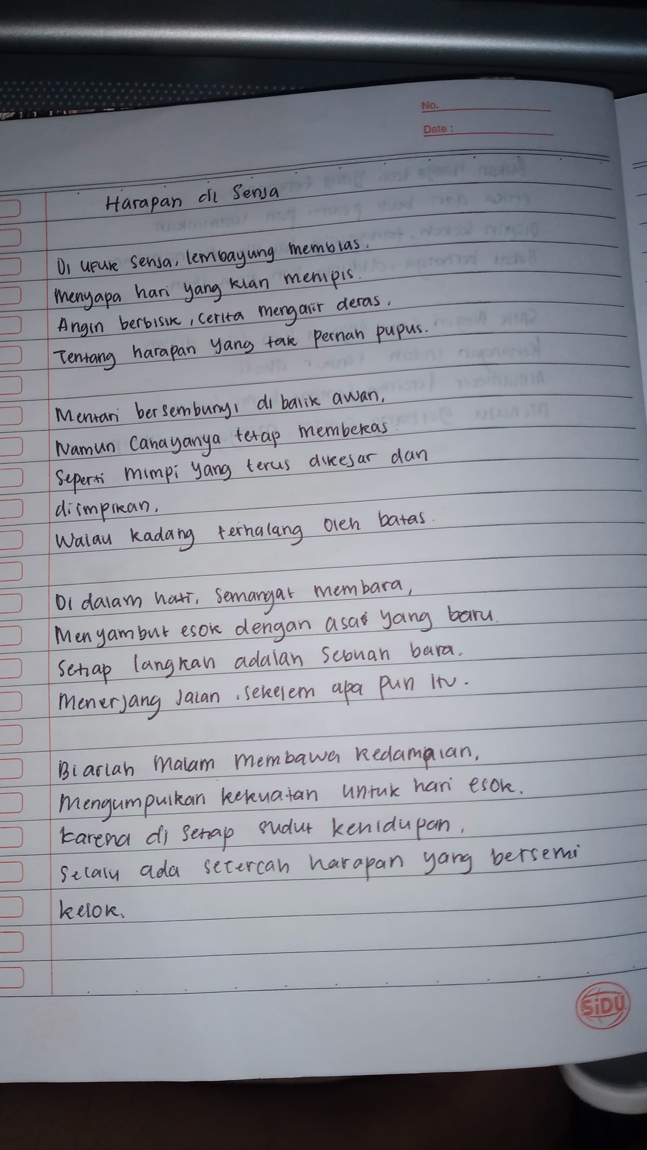 Di pelajaran Seni Musik saya hanya memiliki karya menuliskan tanda kunci pada musik.